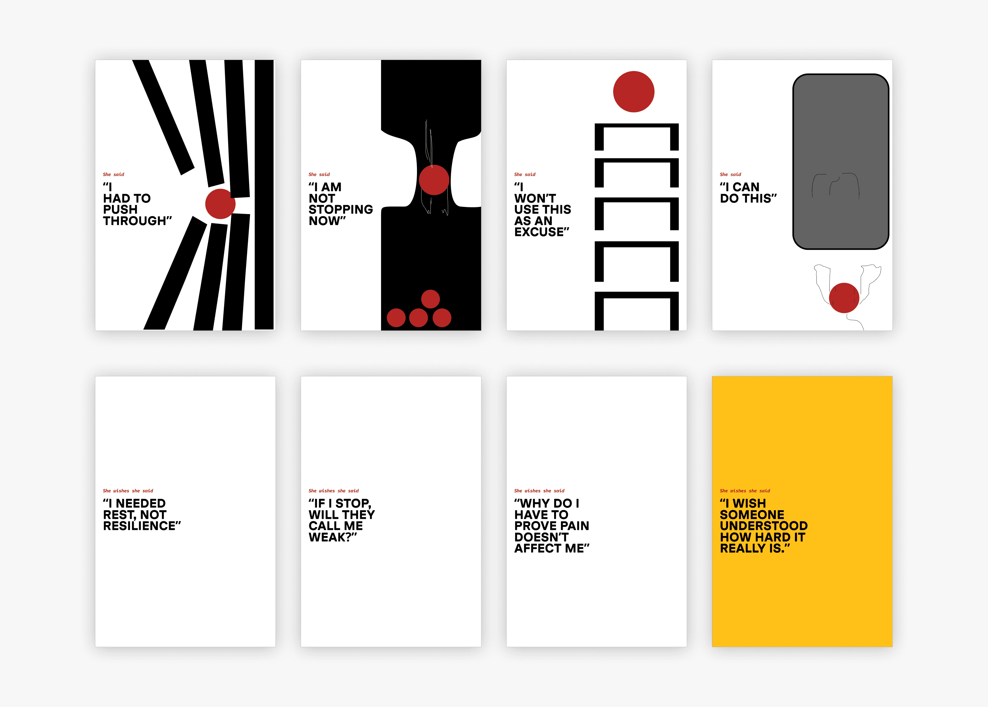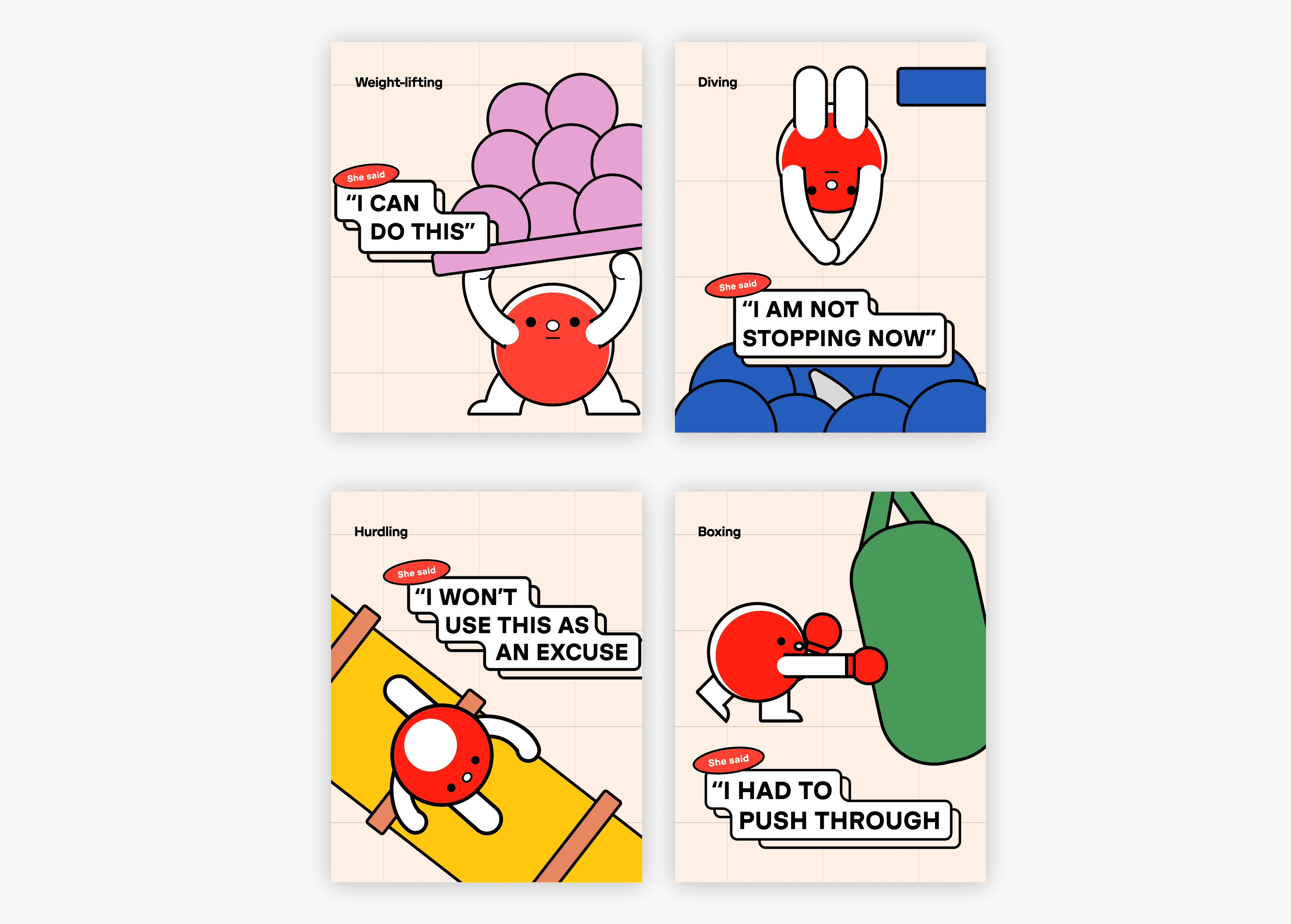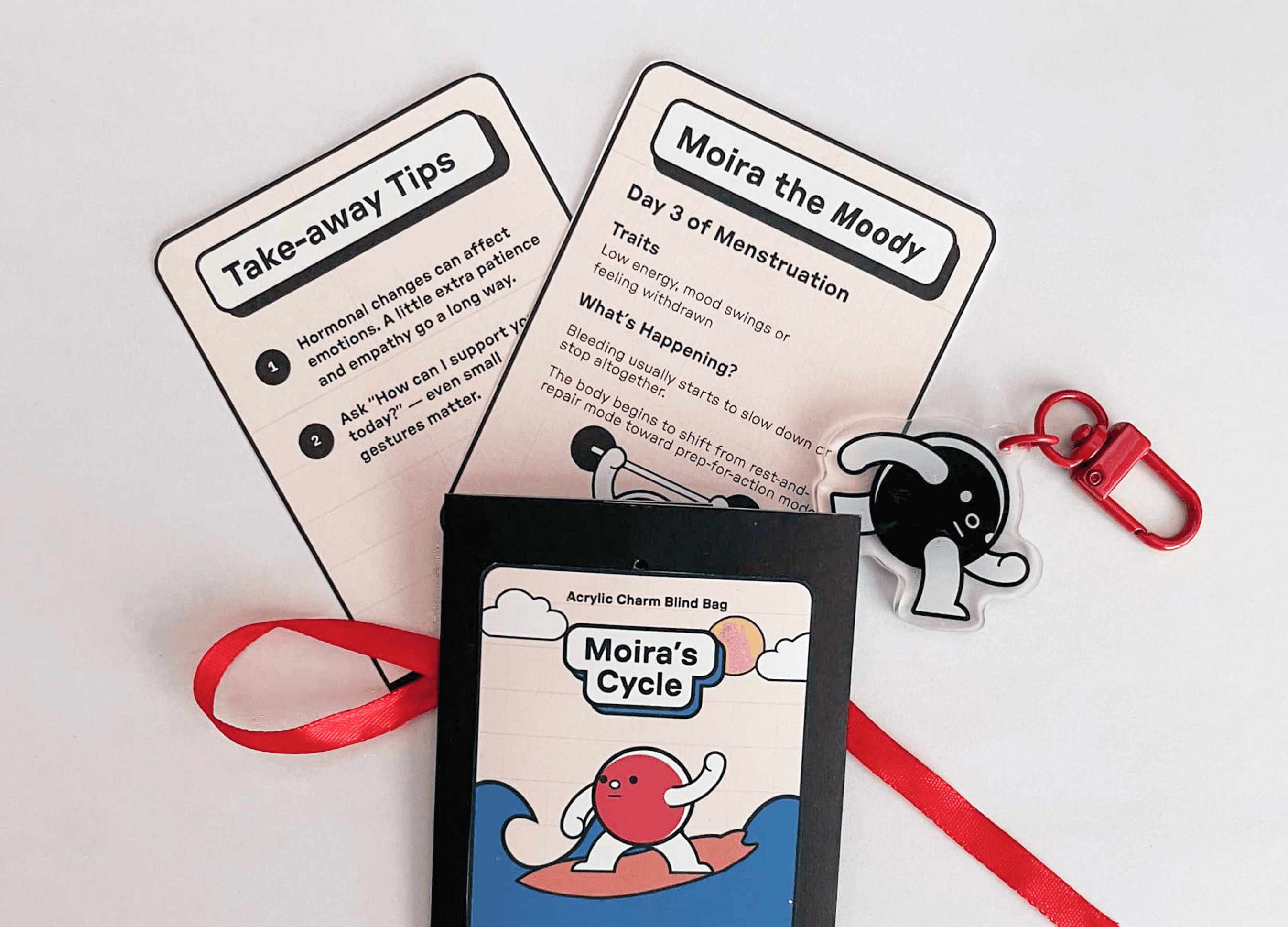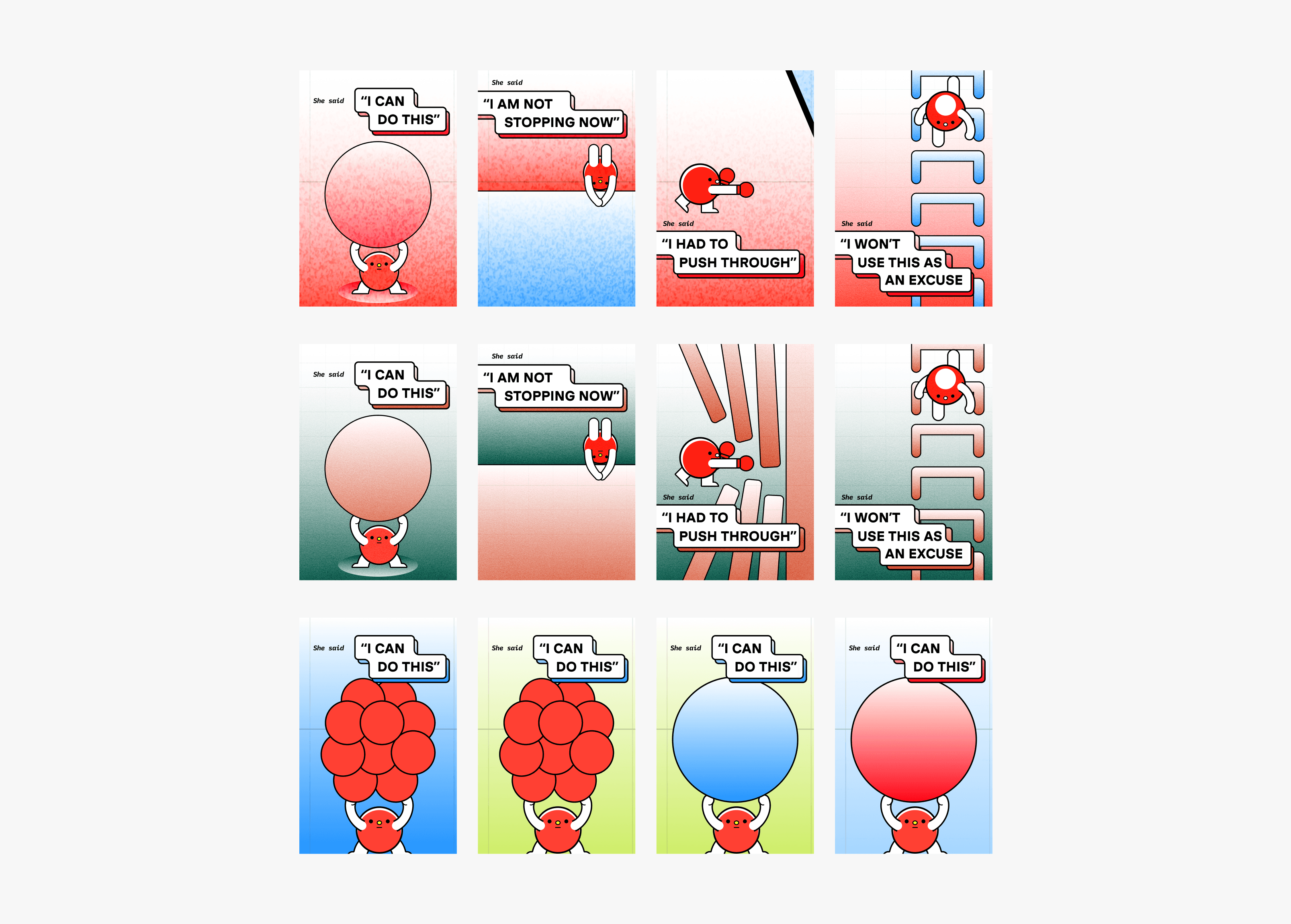 The main mascot colors were changed to be based on the menstrual cycle blood, and the posters were limited to 5 vibrant themed colors.